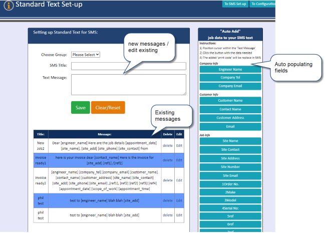If you have repeating text formatted messages to be sent out you are able to create these standard text messages containing Print Marks which will be replaced by the real information for example the engineer name, customer name, site name, site contact etc. These Print Marks can be added to the standard text and when you send a text the Print Marks will be replaced with the real information.